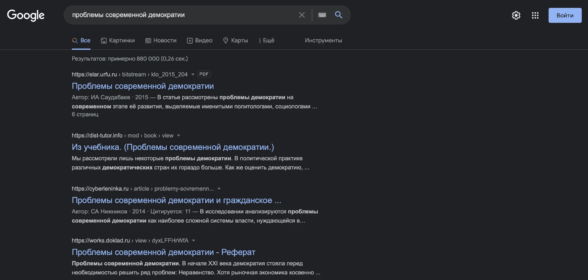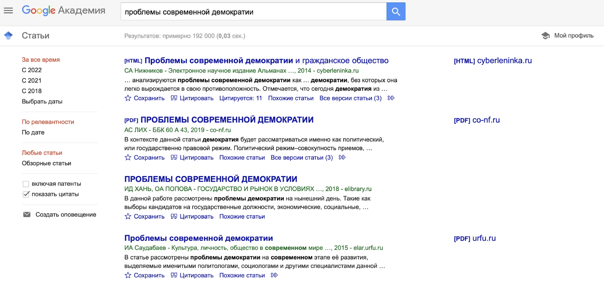 При проверке антиплагиат учитывает все публикации в интернете. Только по одной узкой теме поисковые системы находят сотни тысяч работ, а их число постоянно растет. Например, по фразе «проблемы современной демократии» Google Академия, которая ищет только по научным текстам, выдает 192 тыс результатов.