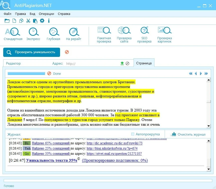Одна из наиболее популярных программ антиплагиат создана биржей контента eTXT. У платформы есть две варианта проверки уникальности — онлайн-сервис и софт, который можно скачать на компьютер. Обе версии используют одну методику — анализ с помощью метода шинглов, проверяющего совпадения по последовательностям слов. После разбивки текста алгоритм ищет повторы с помощью запросов в поисковых системах.