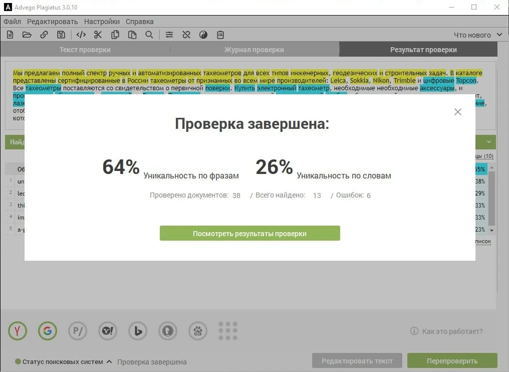 Еще один софт, где можно проверять работы — «Advego Plagiatus». По логике она похожа на Antiplagiarism.NET, но в ней есть несколько дополнительных полезных функций. Например, помимо шинглов для проверки, используется поиск лексических совпадений. Это более сложный процесс, который может выявить поверхностный рерайтинг с синонимизацией и перестановкой. Эта программа антиплагиат умеет выявлять и попытки автоматического повышения уникальности с помощью сервисов обработки текста.